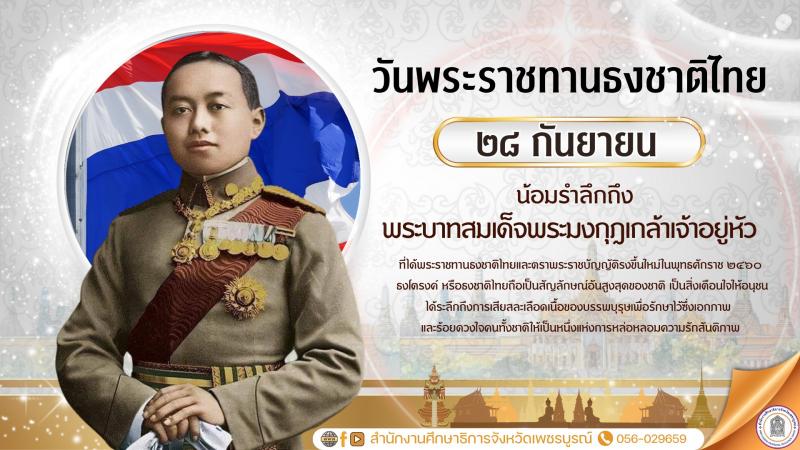 รายละเอียด >>  วันจันทร์ที่ 29 กันยายน 2568 เวลา 08.00 น. สำนักงานศึกษาธิการจังหวัดเพชรบูรณ์ จัดกิจกรรมเนื่องใน“วันพระราชทานธงชาติไทย ประจำปี 2568” โดยมี นางสาวสุภาพันธุ์ ทองพยงค์ ศึกษาธิการจังหวัดเพชรบูรณ์ เป็นประธานเปิดกิจกรรม พร้อมด้วย นางขวัญนภา จันทร์ดี รองศึกษาธิการจังหวัดเพชรบูรณ์ และคณะข้าราชการ/บุคลากร เข้าร่วมกิจกรรมเคารพธงชาติและร้องเพลงชาติไทย เนื่องในวันพระราชทานธงชาติไทย (Thai National Flag Day) ประจำปี 2568 ณ บริเวณหน้าเสาธงสำนักงานศึกษาธิการจังหวัดเพชรบูรณ์ >>ในการจัดกิจกรรม “วันพระราชทานธงชาติไทย (Thai National Flag Day) ประจำปี 2568” เพื่อรำลึกถึงพระมหากรุณาธิคุณของพระบาทสมเด็จพระมงกุฎเกล้าเจ้าอยู่หัว ที่ได้พระราชทานธงไตรรงค์เป็นธงชาติไทยเมื่อวันที่ 28 กันยายน พุทธศักราช 2460 ตลอดจนเป็นการปลูกฝังให้ประชาชนมีความภาคภูมิใจในชาติไทย แสดงออกถึงความรัก ความสามัคคี และการเทิดทูนธงชาติไทยอันเป็นสัญลักษณ์แห่งความเป็นเอกราชและความมั่นคงของประเทศ >>สำหรับความเป็นมาของวันพระราชทานธงชาติไทย คณะรัฐมนตรีมีมติเห็นชอบให้วันที่ 28 กันยายนของทุกปี เป็น วันพระราชทานธงชาติไทย เพื่อรำลึกถึงวันที่พระบาทสมเด็จพระมงกุฎเกล้าเจ้าอยู่หัว (รัชกาลที่ 6) ได้พระราชทานธงไตรรงค์เป็นธงชาติไทย เมื่อวันที่ 28 กันยายน พุทธศักราช 2460 อันเป็นสัญลักษณ์แห่งความเป็นชาติ แสดงถึงความเป็นเอกราชและความสามัคคีของคนไทย โดยสีของธงไตรรงค์มีความหมายคือ สีแดง หมายถึงชาติ, สีขาว หมายถึงศาสนา และ สีน้ำเงิน หมายถึงพระมหากษัตริย์