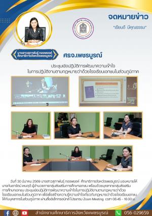 รายละเอียด >>>วันที่ 30 มีนาคม 2569 นางสาวสุภาพันธุ์ ทองพยงค์ ศึกษาธิการจังหวัดเพชรบูรณ์ มอบหมายให้ นางกันยารัตน์ เหมฤดี ผู้อำนวยการกลุ่มส่งเสริมการศึกษาเอกชน พร้อมด้วยบุคลากรกลุ่มส่งเสริมการศึกษาเอกชน ประชุมเชิงปฏิบัติการพัฒนาความเข้าใจในการปฏิบัติงานตามกฎหมายว่าด้วยโรงเรียนเอกชนในส่วนภูมิภาค เพื่อ์เพื่อสร้างความรู้ความเข้าใจเกี่ยวกับกฎหมายว่าด้วยโรงเรียนเอกชน ให้กับบุคลากรในส่วนภูมิภาค ผ่านสื่ออิเล็กทรอนิกส์ โปรแกรม Zoom Meeting เวลา 08.45 – 16.00 น.