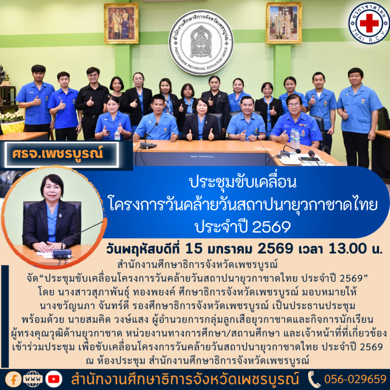 8 21 มกราคม 2569 วันพฤหัสบดีที่ 15 มกราคม 2569 ประชุมขับเคลื่อนโครงการวันคล้ายวันสถาปนายุวกาชาดไทย ประจำปี 2569   [21 มกราคม 2569]   อ่าน 13 ครั้ง