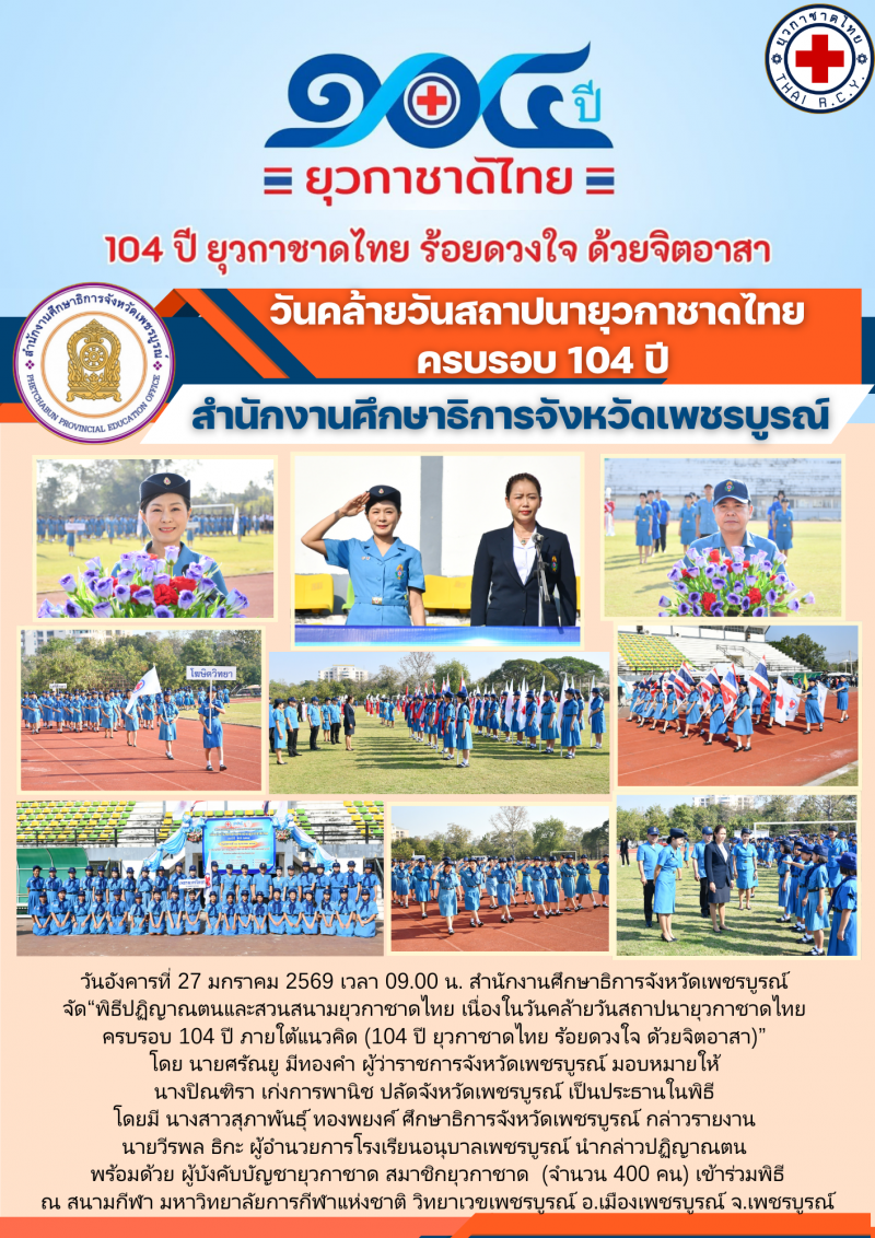 6 30 มกราคม 2569 วันอังคารที่ 27 มกราคม 2569 พิธีปฏิญาณตนและสวนสนามยุวกาชาดไทย เนื่องในวันคล้ายวันสถาปนายุวกาชาดไทย ครบรอบ 104 ปี   [30 มกราคม 2569]   อ่าน 7 ครั้ง