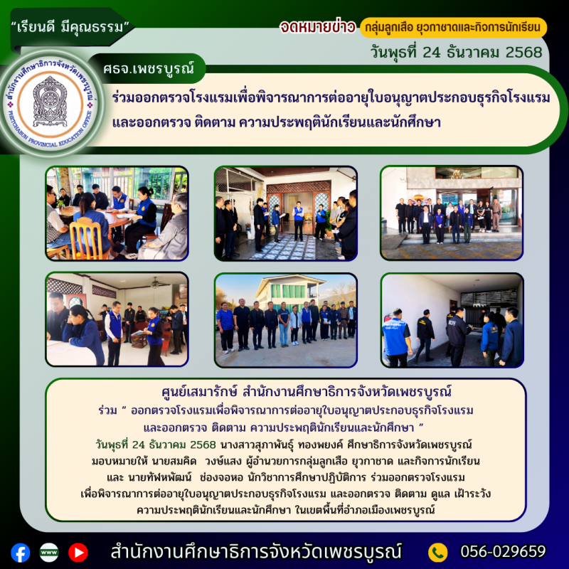 10 25 ธันวาคม 2568 วันพุธที่ 24 ธันวาคม 2568 ศูนย์เสมารักษ์สำนักงานศึกษาธิการจังหวัดเพชรบูรณ์ ร่วมออกตรวจโรงแรม และออกตรวจ ติดตาม ความประพฤตินักเรียนและนักศึกษา   [25 ธันวาคม 2568]   อ่าน 16 ครั้ง