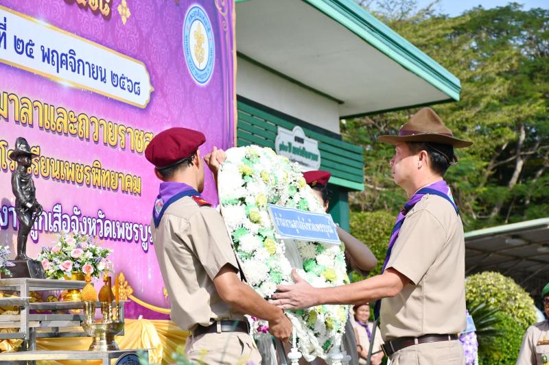 รายละเอียด >>  วันอังคารที่ 25 พฤศจิกายน 2568 เวลา 09.00 น. นางสาวสุภาพันธุ์ ทองพยงค์ ศึกษาธิการจังหวัดเพชรบูรณ์ พร้อมด้วย นายสมคิด วงษ์แสง ผู้อำนวยการกลุ่มลูกเสือ ยุวกาชาดและกิจการนักเรียน และคณะบุคลากร ร่วม"งานวันสมเด็จพระมหาธีรราชเจ้า ประจำปี 2568” โดย นายศรัณยู มีทองคำ ผู้ว่าราชการจังหวัดเพชรบูรณ์ ในฐานะผู้อำนวยการลูกเสือจังหวัดเพชรบูรณ์ มอบหมายให้ นายกกชัย ฉายรัศมีกุล รองผู้ว่าราชการจังหวัดเพชรบูรณ์ รองผู้อำนวยการลูกเสือจังหวัดเพชรบูรณ์ เป็นประธานประกอบพิธี "วันสมเด็จพระมหาธีรราชเจ้า" ประจำปี 2568 โดยมี ดร.ภพเดชา บุญศรี รองผู้อำนวยการสำนักงานเขตพื้นที่การศึกษา รักษาราชการแทน ผู้อำนวยการสำนักงานเขตพื้นที่การศึกษาประถมศึกษาเพชรบูรณ์ เขต 1 กล่าวรายงาน พร้อมด้วย หัวหน้าส่วนราชการ ทหาร ตำรวจ ครูและบุคลากรทางการศึกษา คณะลูกเสือ เนตรนารี เข้าร่วมประกอบพิธี เพื่อเป็นการน้อมรำลึกในพระมหากรุณาธิคุณ ณ สนามโรงเรียนเพชรพิทยาคม อำเภอเมืองเพชรบูรณ์ จังหวัดเพชรบูรณ์