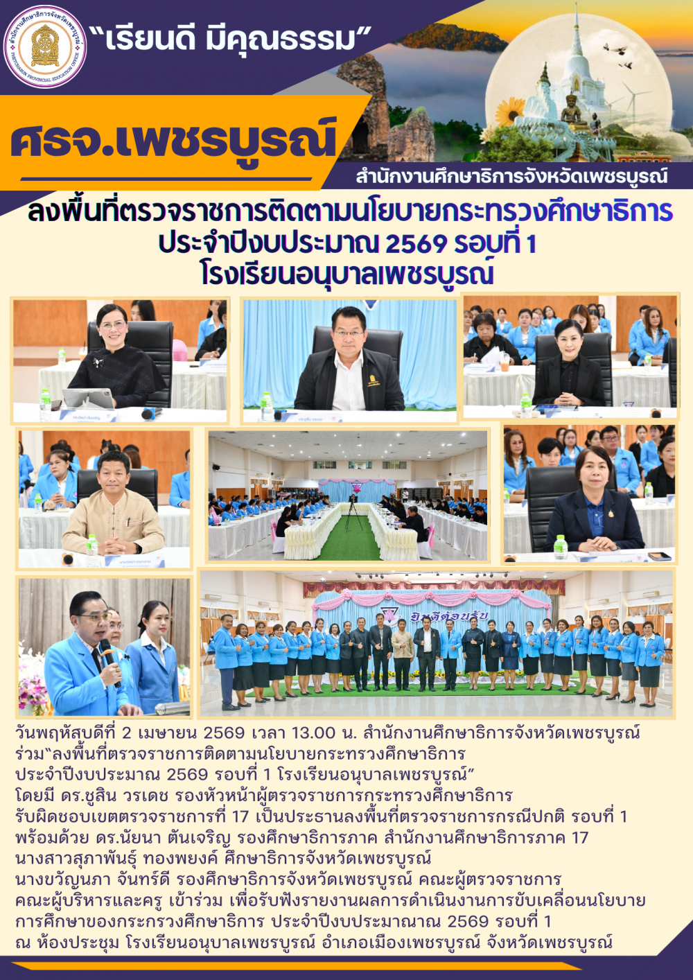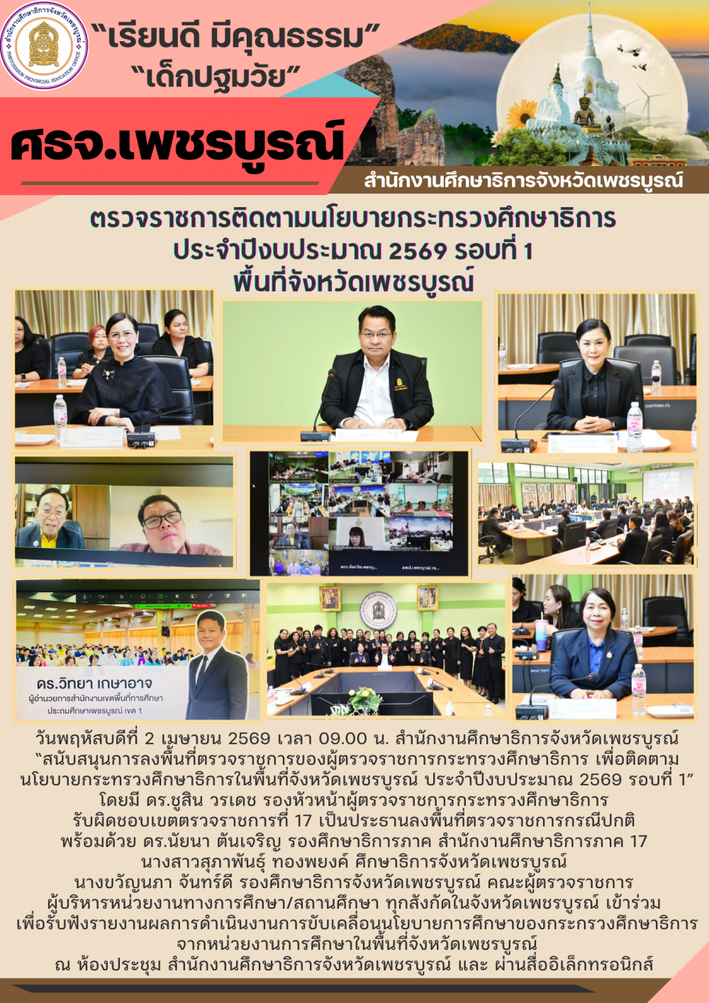 1 02 เมษายน 2569 วันพฤหัสบดีที่ 2 เมษายน 2569 ลงพื้นที่ตรวจราชการติดตามนโยบายกระทรวงศึกษาธิการ ประจำปีงบประมาณ 2569 รอบที่ 1 โรงเรียนอนุบาลเพชรบูรณ์   [02 เมษายน 2569]   อ่าน 4 ครั้ง