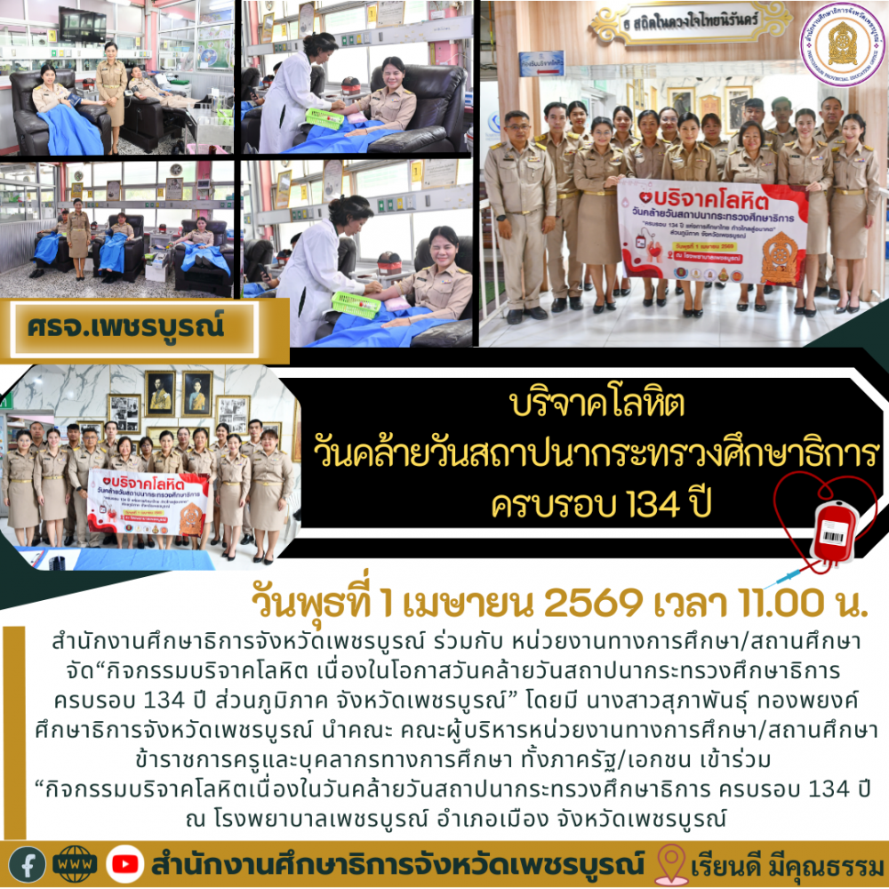 1 01 เมษายน 2569 วันพุธที่ 1 เมษายน 2569 บริจาคโลหิต เนื่องในโอกาสวันคล้ายวันสถาปนากระทรวงศึกษาธิการ ครบรอบ 134 ปี ส่วนภูมิภาค จังหวัดเพชรบูรณ์   [01 เมษายน 2569]   อ่าน 15 ครั้ง