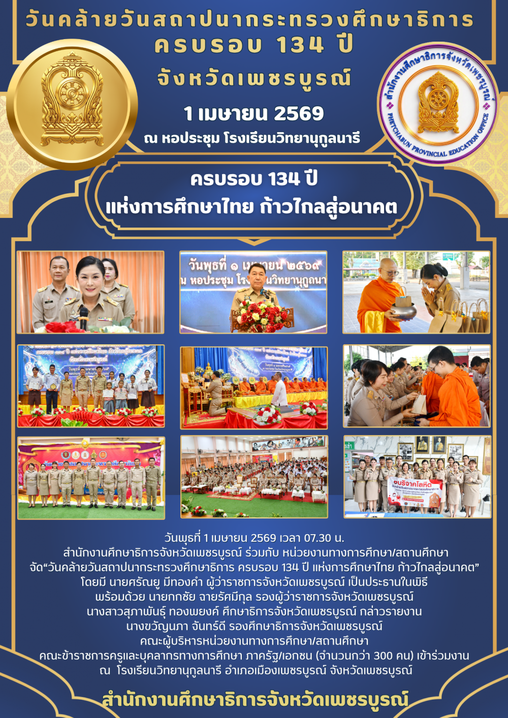 2 01 เมษายน 2569 วันพุธที่ 1 เมษายน 2569 วันคล้ายวันสถาปนากระทรวงศึกษาธิการ ครบรอบ 134 ปี แห่งการศึกษาไทย ก้าวไกลสู่อนาคต   [01 เมษายน 2569]   อ่าน 12 ครั้ง