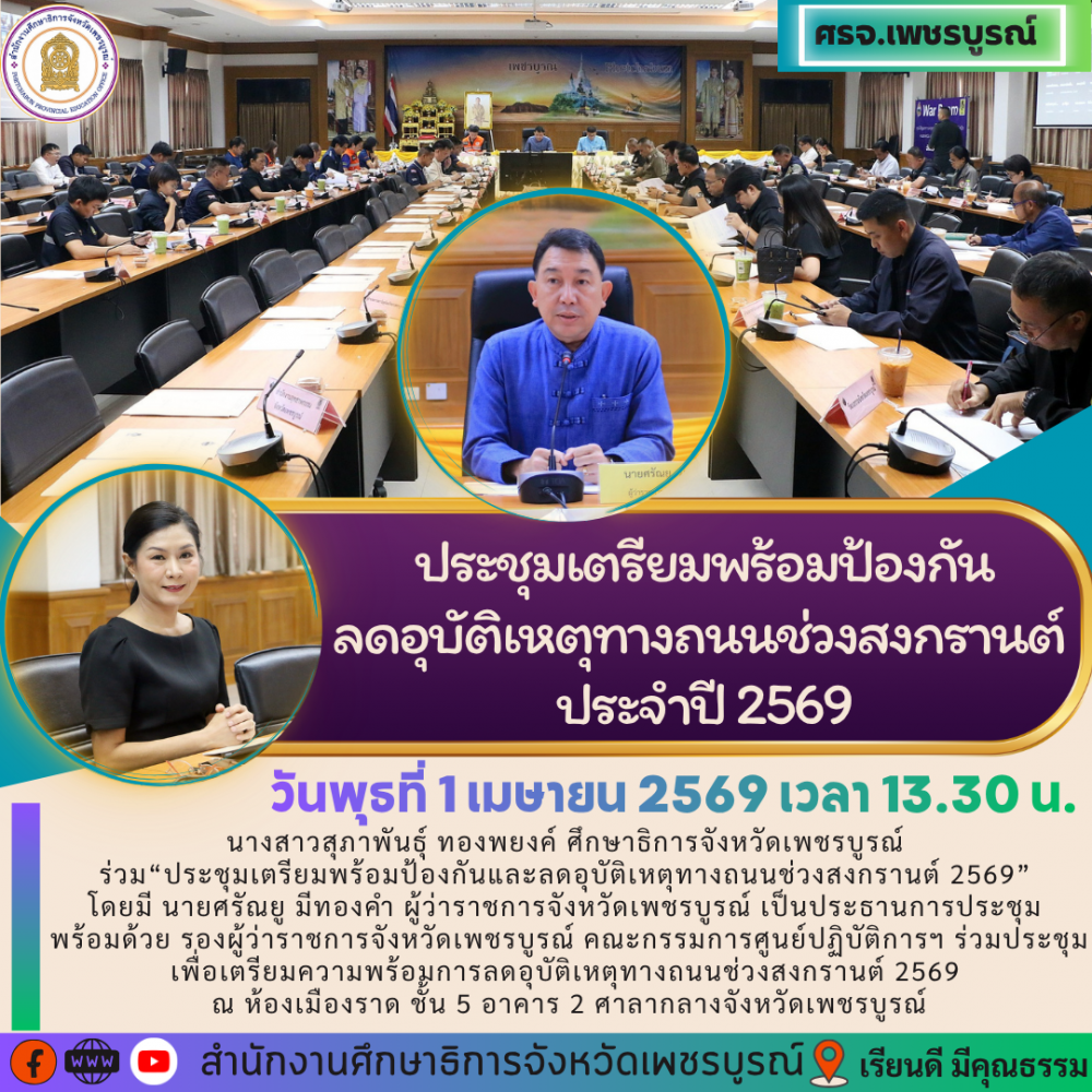 4 01 เมษายน 2569 วันพุธที่ 1 เมษายน 2569 ประชุมเตรียมพร้อมป้องกันและลดอุบัติเหตุทางถนนช่วงสงกรานต์ 2569   [01 เมษายน 2569]   อ่าน 16 ครั้ง