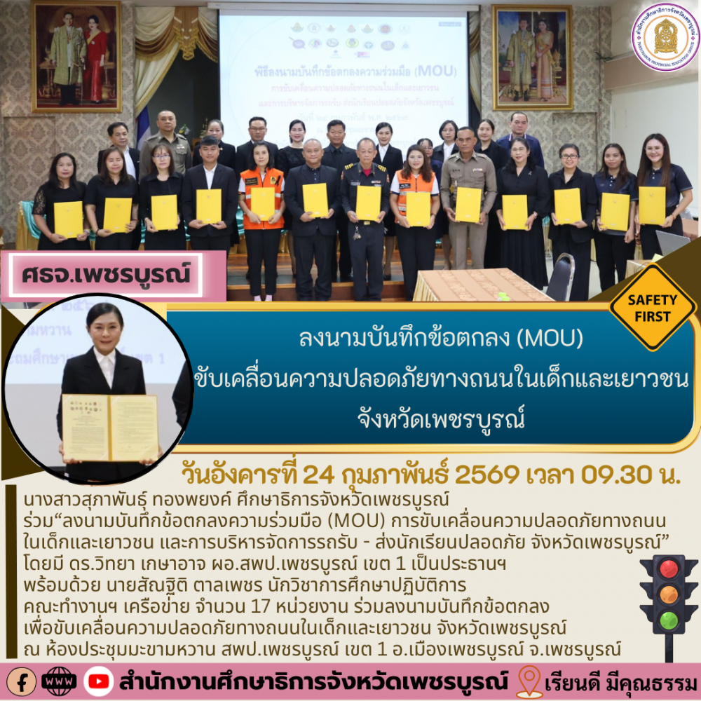 8 25 กุมภาพันธ์ 2569 วันอังคารที่ 24 กุมภาพันธ์ 2569 ลงนามบันทึกข้อตกลงความร่วมมือ (MOU) การขับเคลื่อนความปลอดภัยทางถนนในเด็กและเยาวชน   [25 กุมภาพันธ์ 2569]   อ่าน 4 ครั้ง