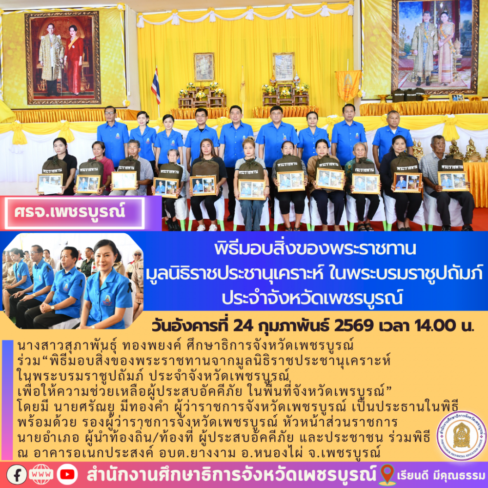 9 24 กุมภาพันธ์ 2569 วันอังคารที่ 24 กุมภาพันธ์ 2569 พิธีมอบสิ่งของพระราชทานจากมูลนิธิราชประชานุเคราะห์ ในพระบรมราชูปถัมภ์ ประจำจังหวัดเพชรบูรณ์   [24 กุมภาพันธ์ 2569]   อ่าน 4 ครั้ง