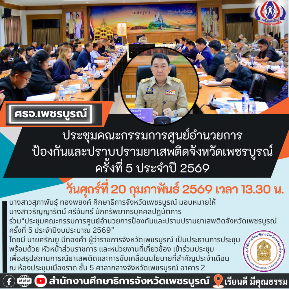 11 23 กุมภาพันธ์ 2569 วันศุกร์ที่ 20 กุมภาพันธ์ 2569 ประชุมคณะกรรมการศูนย์อำนวยการป้องกันและปราบปรามยาเสพติดจังหวัดเพชรบูรณ์ ครั้งที่ 5 ประจำปี 2569   [23 กุมภาพันธ์ 2569]   อ่าน 3 ครั้ง