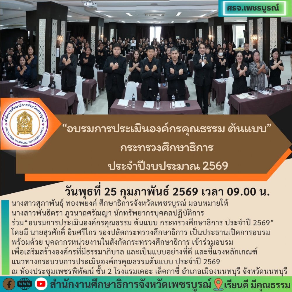 4 26 กุมภาพันธ์ 2569 วันพุธที่ 25 กุมภาพันธ์ 2569 อบรมการประเมินองค์กรคุณธรรม ต้นแบบ กระทรวงศึกษาธิการ ประจำปี 2569   [26 กุมภาพันธ์ 2569]   อ่าน 4 ครั้ง