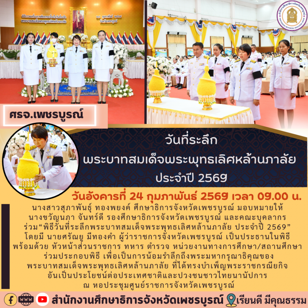 10 24 กุมภาพันธ์ 2569 วันอังคารที่ 24 กุมภาพันธ์ 2569 พิธีวันที่ระลึกพระบาทสมเด็จพระพุทธเลิศหล้านภาลัย ประจำปี 2569   [24 กุมภาพันธ์ 2569]   อ่าน 5 ครั้ง