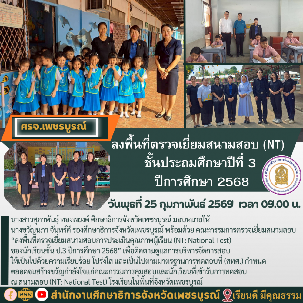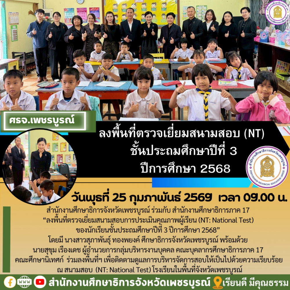 5 26 กุมภาพันธ์ 2569 วันพุธที่ 25 กุมภาพันธ์ 2569 ลงพื้นที่ตรวจเยี่ยมสนามสอบการประเมินคุณภาพผู้เรียน (NT: National Test) ของนักเรียนชั้น ป.3 ปีการศึกษา 2568   [26 กุมภาพันธ์ 2569]   อ่าน 4 ครั้ง