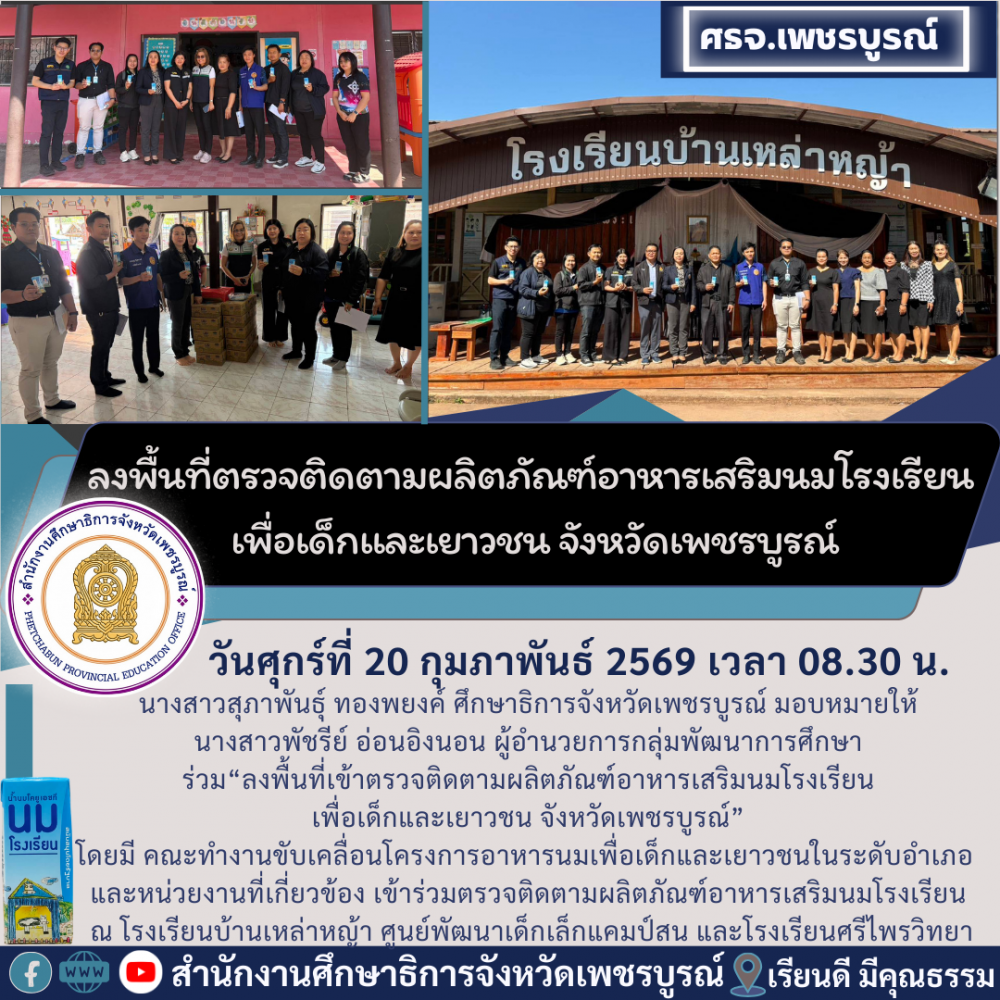 12 20 กุมภาพันธ์ 2569 วันศุกร์ที่ 20 กุมภาพันธ์ 2569 ลงพื้นที่เข้าตรวจติดตามผลิตภัณฑ์อาหารเสริมนมโรงเรียน เพื่อเด็กและเยาวชน จังหวัดเพชรบูรณ์   [20 กุมภาพันธ์ 2569]   อ่าน 5 ครั้ง