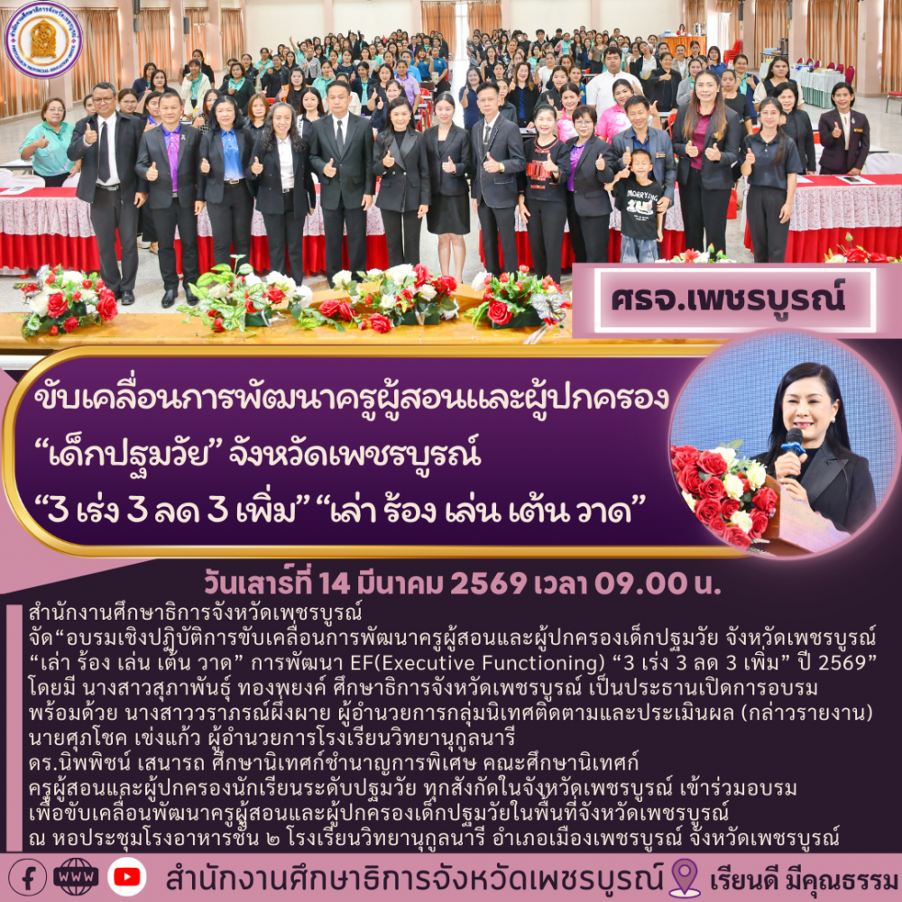 11 16 มีนาคม 2569 วันเสาร์ที่ 14 มีนาคม 2569 อบรมเชิงปฏิบัติการขับเคลื่อนการพัฒนาครูผู้สอนและผู้ปกครองเด็กปฐมวัย จังหวัดเพชรบูรณ์ “3 เร่ง 3 ลด 3 เพิ่ม” ประจำปี 2569   [16 มีนาคม 2569]   อ่าน 10 ครั้ง