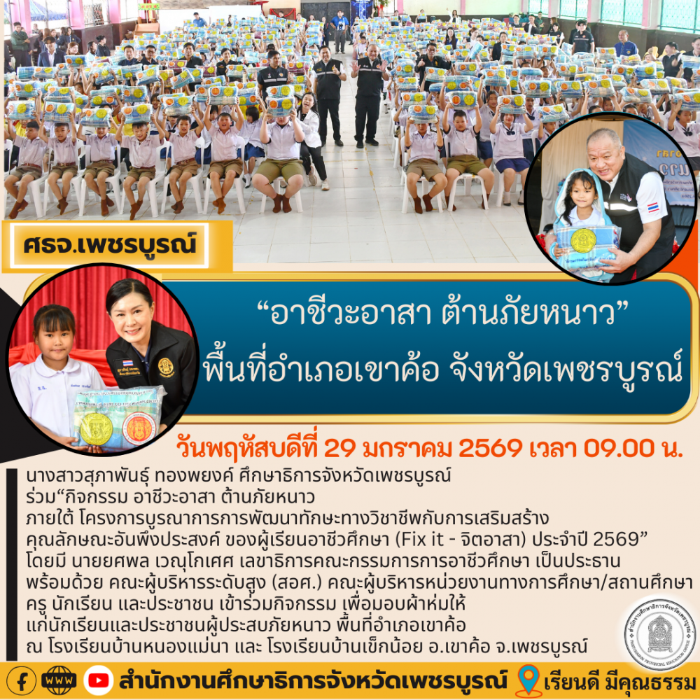 6 30 มกราคม 2569 วันพฤหัสบดีที่ 29 มกราคม 2569 กิจกรรมอาชีวะอาส ต้านภัยหนาว (Fix it - จิตอาสา) พื้นที่อำเภอเขาค้อ จังหวัดเพชรบูรณ์   [30 มกราคม 2569]   อ่าน 24 ครั้ง