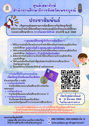 รายละเอียดข่าว : ประชาสัมพันธ์ ศูนย์เสมารักษ์ สำนักงานศึกษาธิการจังหวัดเพชรบูรณ์ "เชิญชวนส่งผลงานการคัดเลือกรางวัลเชิดชูเกียรติพนักงานเจ้าหน้าที่ส่งเสริมความประพฤตินักเรียนและนักศึกษา กระทรวงศึกษาธิการ (รางวัลเสมาพิทักษ์) ประจำปี 2569" >>เปิดรับสมัครตั้งแต่บัดนี้ถึงวันที่ 31 มีนาคม 2569 >>สามารถยื่นใบสมัคร ได้ที่ ณ สำนักงานศึกษาธิการจังหวัดเพชรบูรณ์ กลุ่มลูกเสือ ยุวกาชาดและกิจการนักเรียน >>ติดต่อสอบถามเพิ่มเติม ได้ที่ 095-7597561 056-029659 ต่อ 12