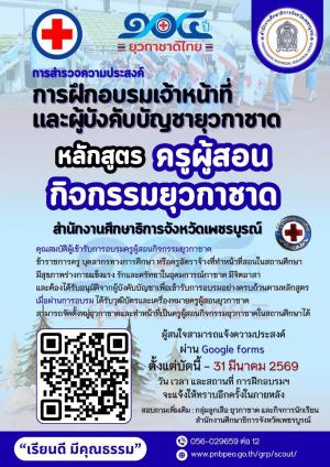 รายละเอียดข่าว : ประชาสัมพันธ์ สำนักงานศึกษาธิการจังหวัดเพชรบูรณ์ "สำรวจความประสงค์การฝึกอบรมเจ้าหน้าที่และผู้บังคับบัญชายุวกาชาด" "หลักสูตร ครูผู้สอนกิจกรรมยุวกาชาด" >>เปิดรับสมัครตั้งแต่บัดนี้ถึงวันที่ 31 มีนาคม 2569 >>ผู้สนใจสามารถแจ้งความประสงค์ ผ่าน Google forms https://forms.gle/cDCvAKiA3YMP8HVj7 กลุ่มลูกเสือ ยุวกาชาดและกิจการนักเรียน >>ติดต่อสอบถามเพิ่มเติม ได้ที่ กลุ่มลูกเสือ ยุวกาชาดและกิจการนักเรียน สำนักงานศึกษาธิการจังหวัดเพชรบูรณ์ 095-7597561 056-029659 ต่อ 12
