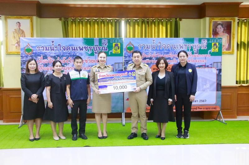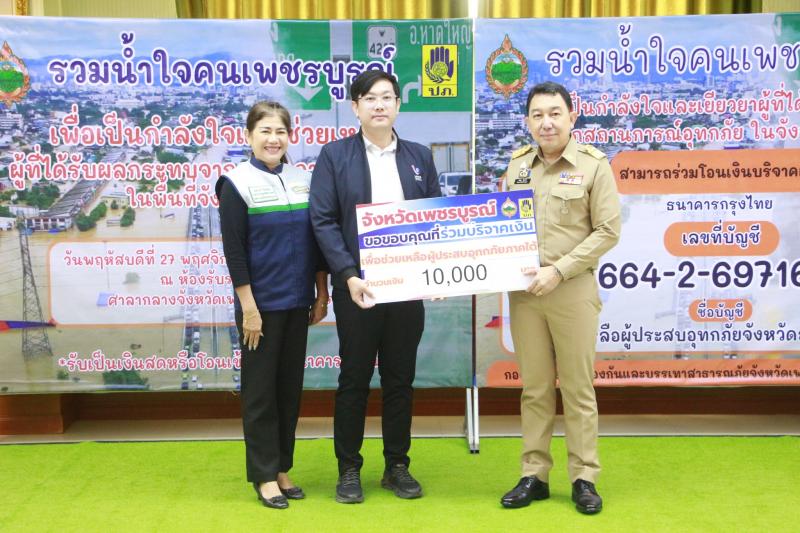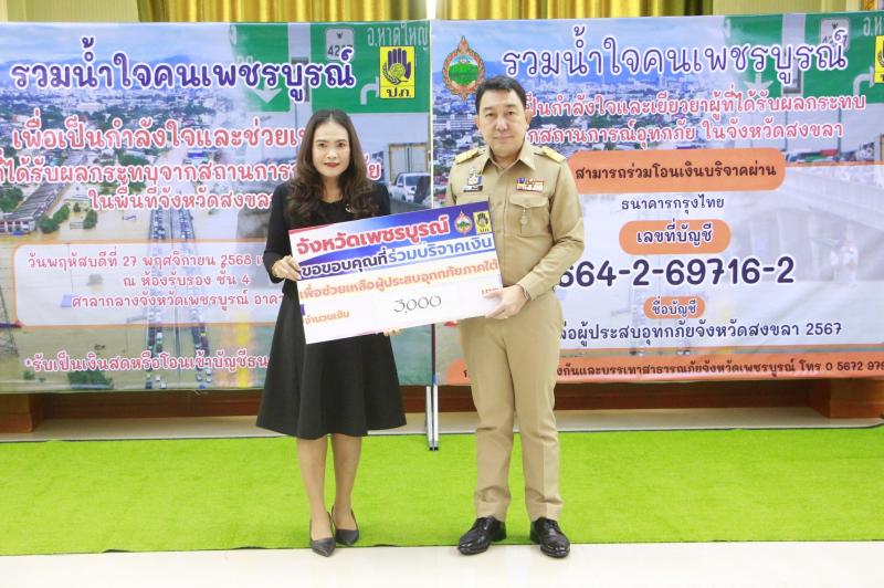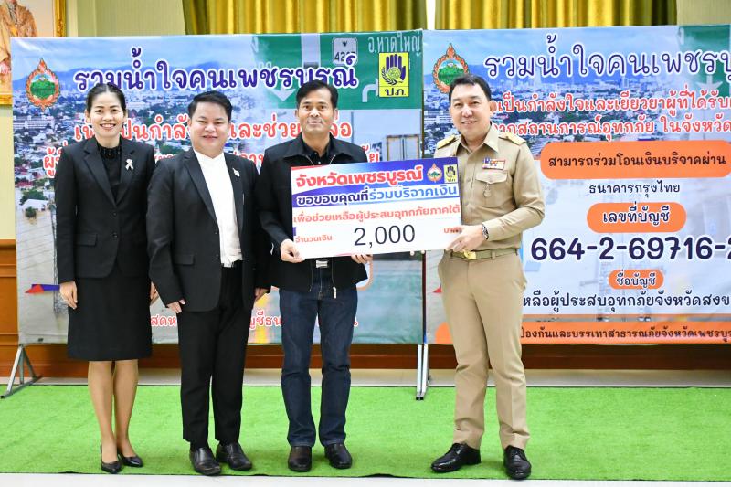 รายละเอียด >>  วันพฤหัสบดีที่ 27 พฤศจิกายน 2568 เวลา 08.30 น. สำนักงานศึกษาธิการจังหวัดเพชรบูรณ์ ร่วมกับ โรงเรียนเอกชนในจังหวัดเพชรบูรณ์ ร่วม“บริจาคเงินช่วยเหลือผู้ประสบอุทกภัยจังหวัดสงขลา “รวมน้ำใจคนเพชรบูรณ์” (จำนวน 25,000 บาท)” โดยมี นายศรัณยู มีทองคำ ผู้ว่าราชการจังหวัดเพชรบูรณ์ เป็นประธานในพิธี พร้อมด้วย หัวหน้าส่วนราชการ ภาคเอกชน และประชาชนในพื้นที่ ร่วมบริจาคเงิน เพื่อเป็นกำลังใจและช่วยเหลือผู้ประสบภัยจากสถานการณ์อุทกภัยจังหวัดสงขลา ณ ห้องรับรอง ชั้น 4 อาคาร 2 ศาลากลางจังหวัดเพชรบูรณ์ >>นายศรัณยู มีทองคำ ผู้ว่าราชการจังหวัดเพชรบูรณ์ เปิดเผยว่า ขณะนี้จังหวัดสงขลากำลังเผชิญเหตุอุทกภัยรุนแรงจากฝนตกหนักต่อเนื่อง ส่งผลกระทบต่อชีวิตความเป็นอยู่และทรัพย์สินของประชาชนในวงกว้าง จังหวัดเพชรบูรณ์จึงได้จัดกิจกรรมครั้งนี้ขึ้นเพื่อเป็นการส่งต่อพลังใจและให้ความช่วยเหลือแก่พี่น้องชาวสงขลาที่กำลังประสบความเดือดร้อน พร้อมขอบคุณทุกภาคส่วนที่ร่วมกันสนับสนุนอย่างดียิ่ง >>โดยภายในงาน ผู้ว่าราชการจังหวัดเพชรบูรณ์ รองผู้ว่าราชการจังหวัด และหัวหน้าส่วนราชการ ข้าราชการ ภาคธุรกิจ องค์กรปกครองส่วนท้องถิ่น และประชาชน ได้ร่วมกันบริจาคเงินช่วยเหลือผู้ประสบอุทกภัย โดยมียอดบริจาคในเช้านี้ ทั้งสิ้น 324,699 บาท ซึ่งจะถูกส่งต่อไปช่วยเหลือผู้ประสบภัยในจังหวัดสงขลาโดยตรง สำหรับประชาชนและผู้ที่สนใจบริจาคสามารถร่วมเป็นส่วนหนึ่งในการช่วยเหลือผู้ประสบภัยครั้งนี้ โดยบริจาคเพิ่มเติมได้ผ่านบัญชี ธนาคารกรุงไทย เลขที่ 664-2-69716-2 ชื่อบัญชี “ช่วยเหลือผู้ประสบอุทกภัยจังหวัดสงขลา 2567” ซึ่งเป็นบัญชีของจังหวัดสงขลาที่เปิดเพื่อรับบริจาคช่วยเหลือผู้ประสบอุทกภัยโดยตรง เพื่อส่งต่อความห่วงใยไปยังพี่น้องชาวสงขลาที่กำลังรอการช่วยเหลือในขณะนี้